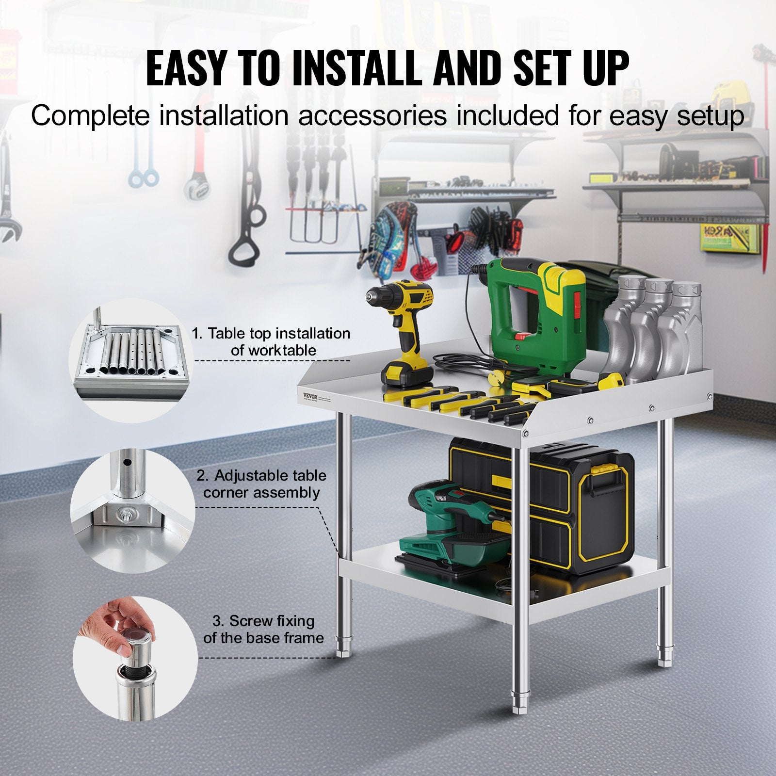 Användarvänlig design: Med justerbara hyllor i 3 nivåer erbjuder detta arbetsbord den mest användarvänliga och praktiska funktionaliteten. Justera helt enkelt hyllhöjden med skruvar för att få plats med föremål i olika storlekar. Den 2-tums backsplash förhindrar värdefull utrustning och tillbehör från att glida av bordet och skyddar även mot vattenstänk.