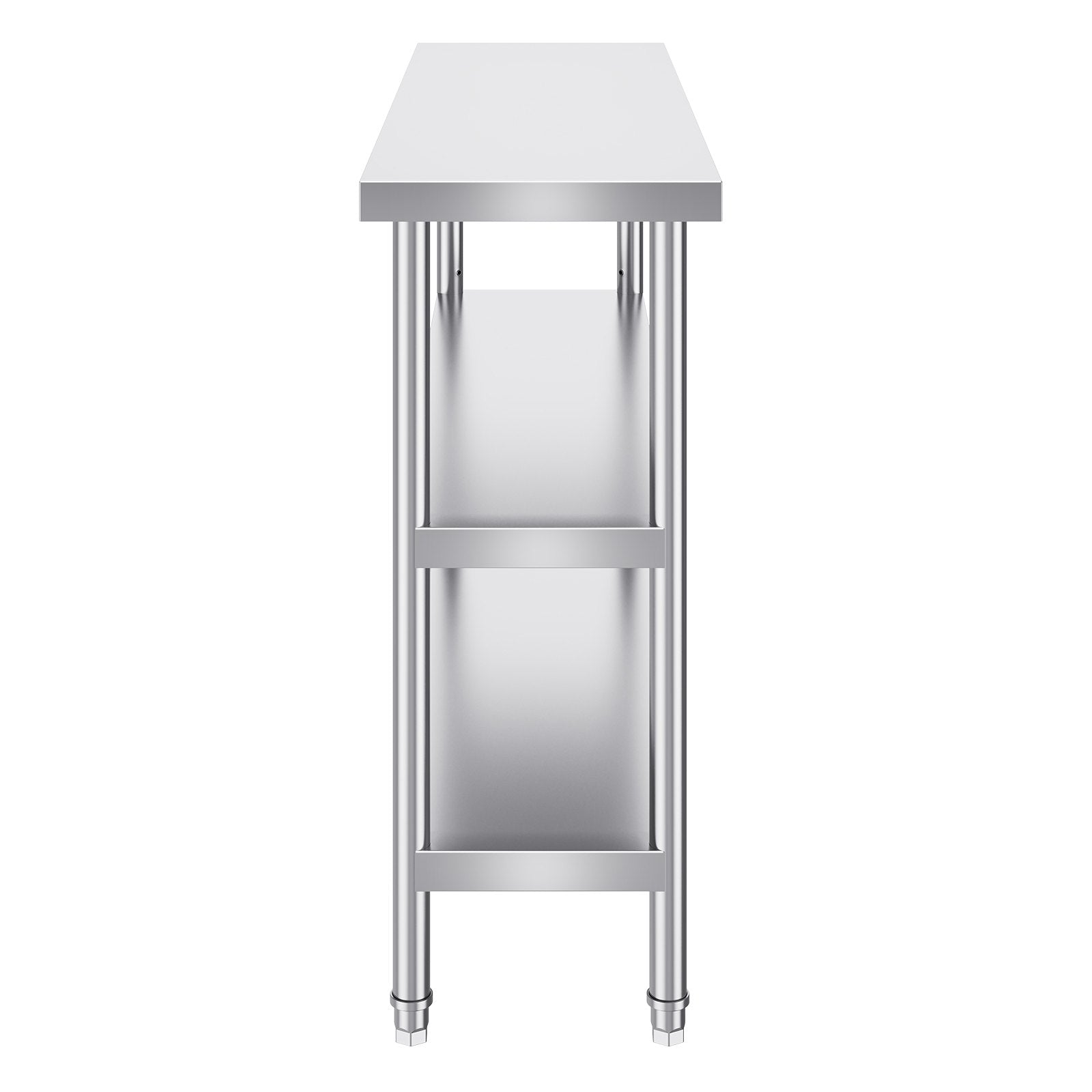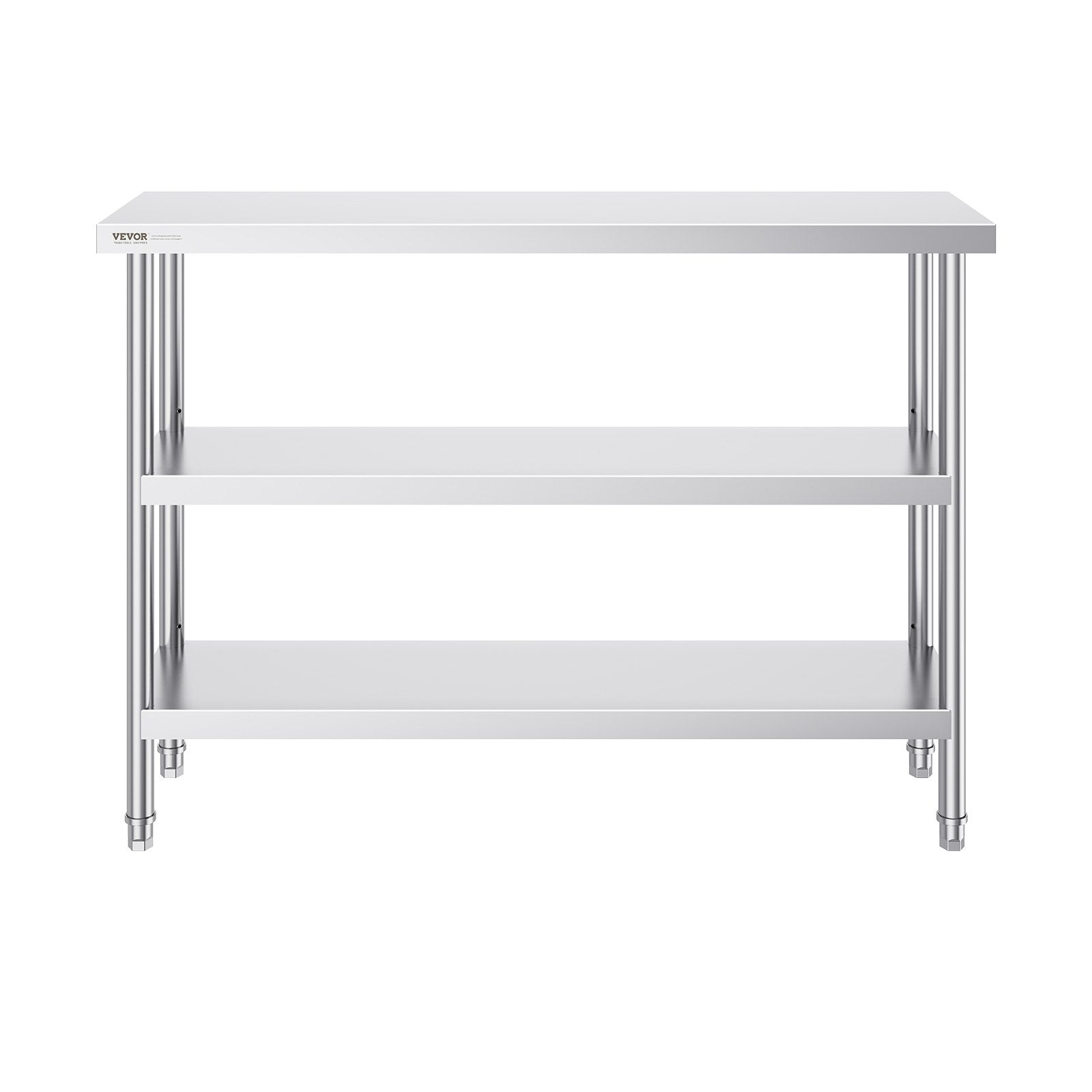 Högkvalitativt rostfritt stål: Detta arbetsbord, som mäter 14 x 48 x 34 tum, är tillverkat av SUS201 rostfritt stål för bordsskivan, hyllorna och benen. Den erbjuder överlägsen rostbeständighet, ett elegant utseende och en slät yta som är lätt att rengöra med en enkel avtorkning. NSF-certifierad, den uppfyller stränga folkhälsostandarder, vilket säkerställer ett långvarigt skydd för din hälsa.