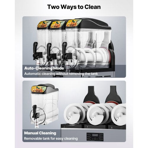 Hållbar och lätt att rengöra: Denna kommersiella slushiemaskin är tillverkad med ett hölje i rostfritt stål och en livsmedelsgodkänd PC-tank, och är byggd för att hålla länge och vara lätt att rengöra. Tanken har automatisk rengöring med en knapptryckning, och de modulära komponenterna kan enkelt demonteras utan verktyg för problemfritt underhåll och rengöring.