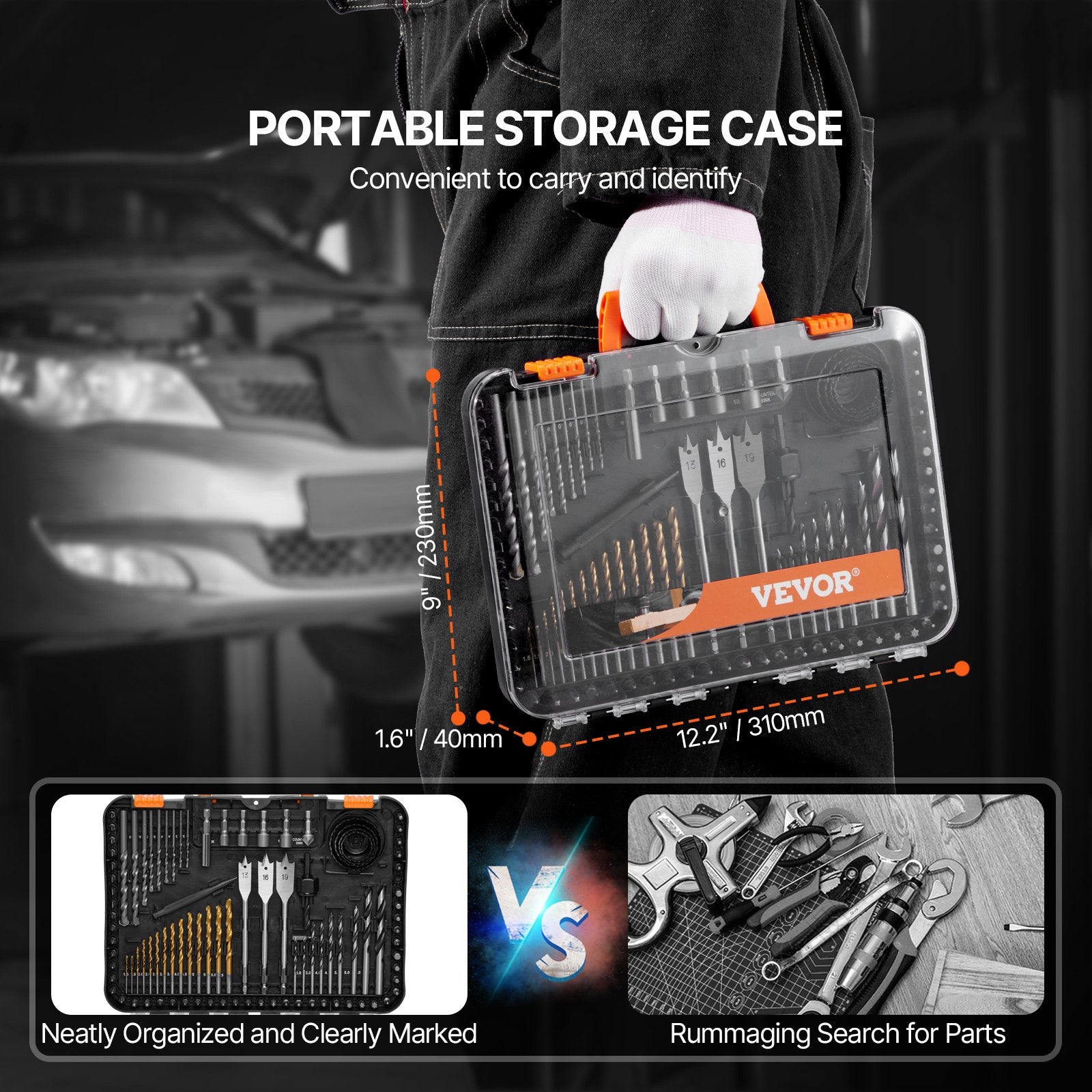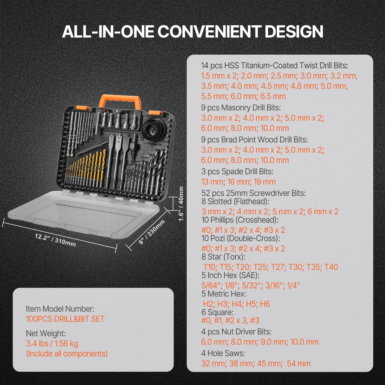 Integrerad bekvämlighetssats: Denna 100-delade borr- och medbringarbitssats innehåller olika borrkronor, skruvmejslar och mutterdragare. Den stöder borrning och fästning på metall, trä, murverk och plast, vilket gör den idealisk för gör-det-själv-entusiaster och proffs. Det är också en omtänksam present till familj och vänner.