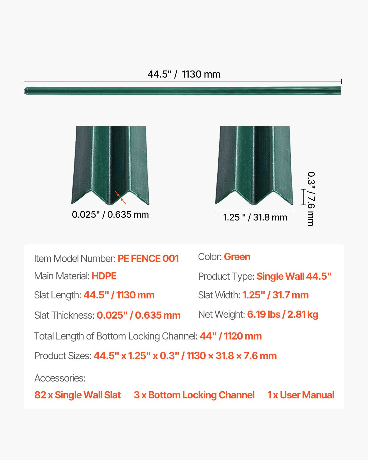 Enväggsskyddslameller: Designade speciellt för 4 tum höga staket, dessa bottenlåsande insynsskydd är cirka 44,5 tum långa, vilket säkerställer en idealisk passform och undviker att spjälorna sträcker sig över staketets topp.