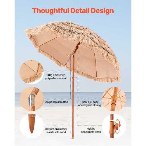 Bekväm användning: Detta tiki-strandparasoll öppnas och stängs manuellt med en smidig tryck- och dragrörelse, vilket kräver minimal ansträngning. Den justerbara höjden passar små uteplatser eller stora utomhusloungeområden och smälter enkelt in i olika miljöer.