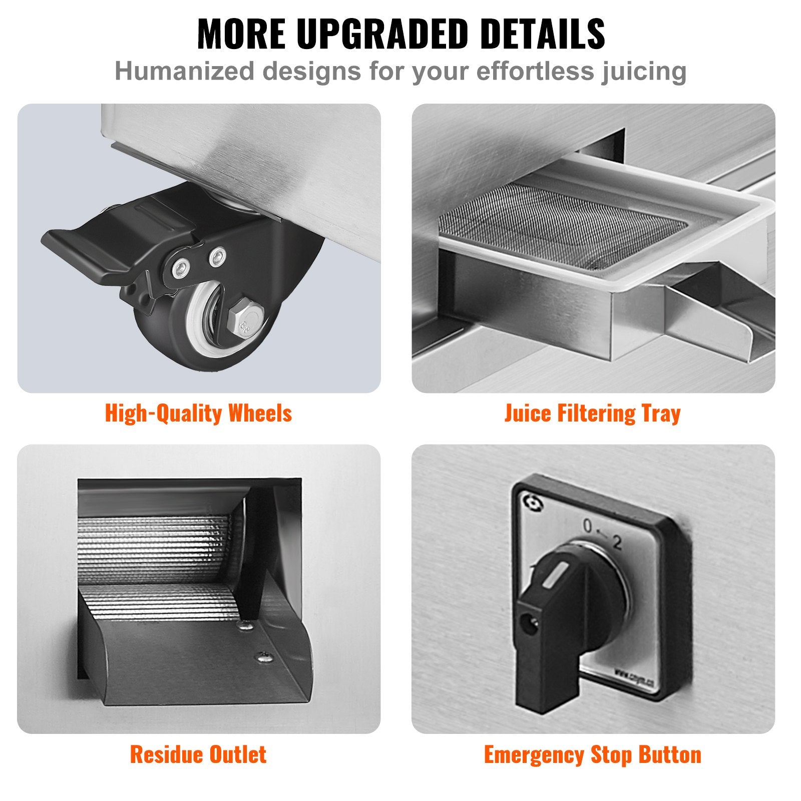Effektiv juicepressningsproduktivitet: VEVOR elektrisk sockerrörsjuicer är utrustad med 750W kraftfull motor, tillsammans med 3 solida rullar av rostfritt stål, vilket gör sockerrörsjuicing mer enkel och effektiv. 661LBS/H hög produktivitet maximerar juiceproduktion och effektivitet.