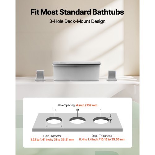 3-hålsinstallation: Denna badkarsblandare för däckmontering är utrustad med en 3-håls däckmonterad installationsdesign och passar perfekt för de flesta badkar. Med en håldiameter på 31–35,81 mm och en diskhotjocklek på 10,16–35,56 mm är installationen snabb och enkel, vilket ger stor bekvämlighet.