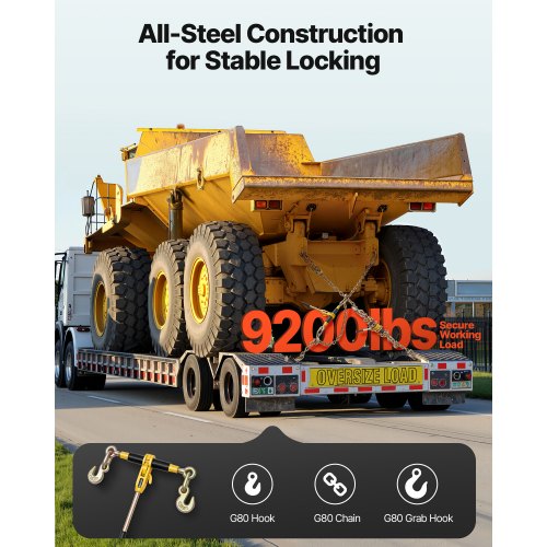 Kompatibilitet och anpassningsbarhet: Kedjebindaren inkluderar 20 fot G80-kedja (3/8-tums diameter) och stöder 3/8-tums till 1/2-tums kedjor. Det justerbara krokavståndet (23,2-30,7 tum) passar lastbilar, kranar och pickuper, perfekt för att säkra trä, utrustning med mera.