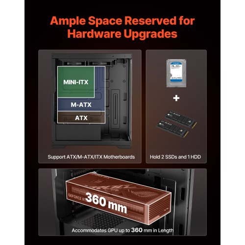 Expanderbar design: Detta speldatorchassi är kompatibelt med ATX/M-ATX/Mini-ITX-moderkort och stöder GPU:er upp till 360 mm (14,17 tum) i längd. Det inkluderar även 2 x 2,5-tums SSD-platser och 1 x 3,5-tums hårddiskfack, vilket säkerställer snabba starttider och flexibel lagringsutbyggnad.