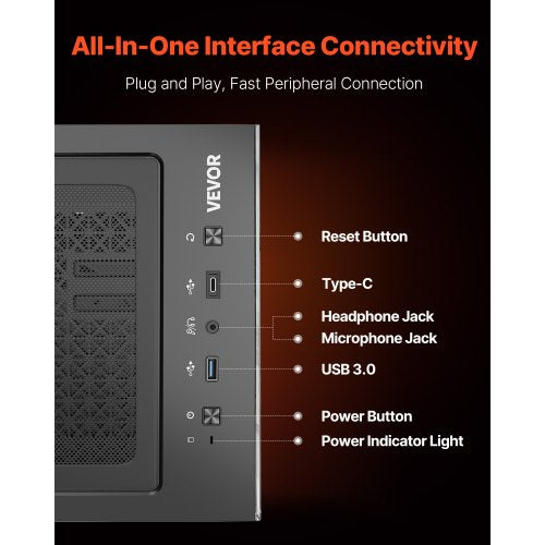 Effektivt I/O-gränssnitt: Den noggrant utformade I/O-panelen har en strömbrytare, 1 x Typ-C-port, 1 x USB 3.0 Typ-A, mikrofonuttag, ljuduttag, återställningsknapp och ström-LED. Detta PC-spelchassin ger dig stor bekvämlighet.