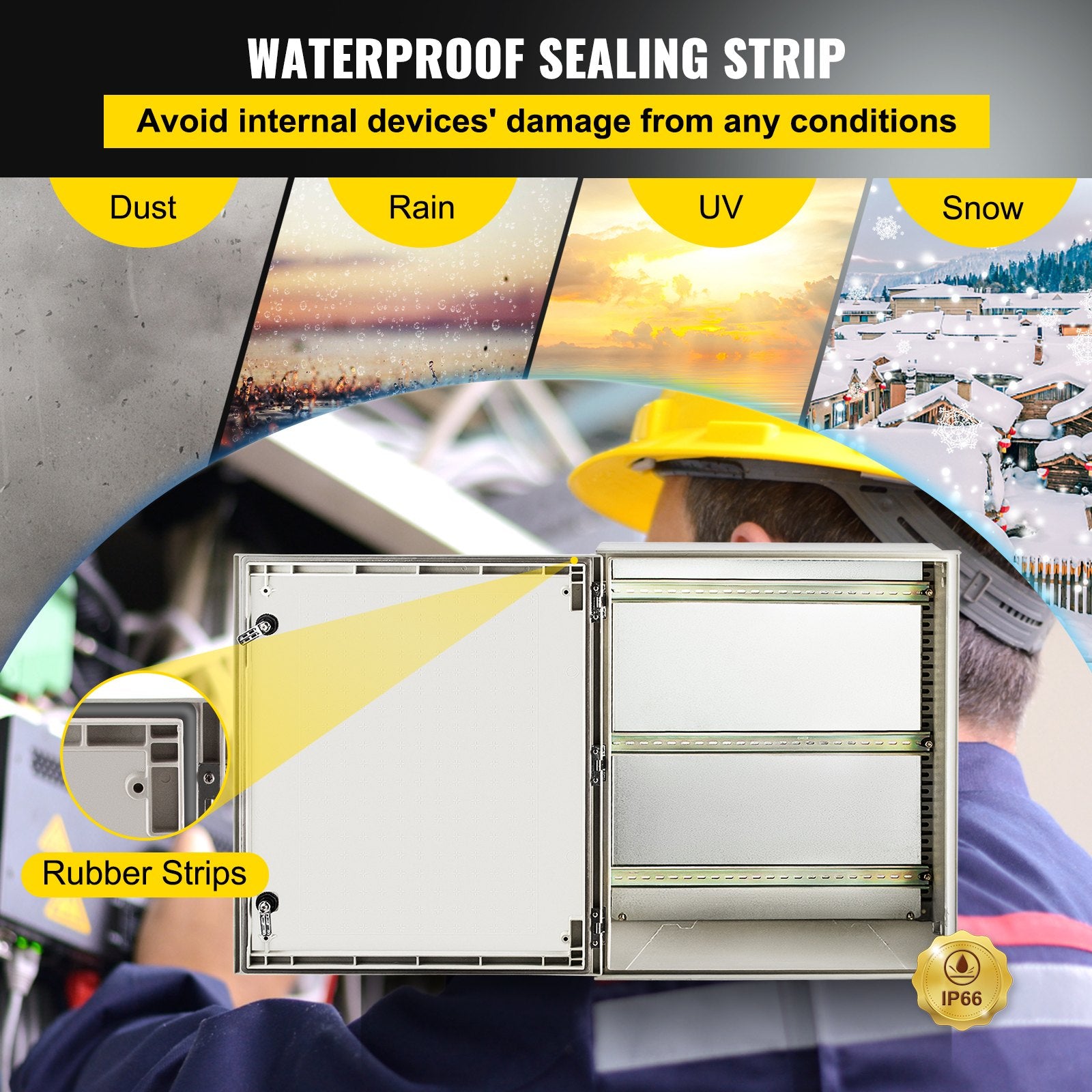 IP66 vattentät klass: Tätningslisten har utmärkt tätningsprestanda, och den elektriska kapslingen av glasfiber säkerställer en optimal skyddsnivå på IP66, vilket undviker att smuts och vatten kommer in i lådan när locket öppnas. Håll ordning på alla dina kretsar.