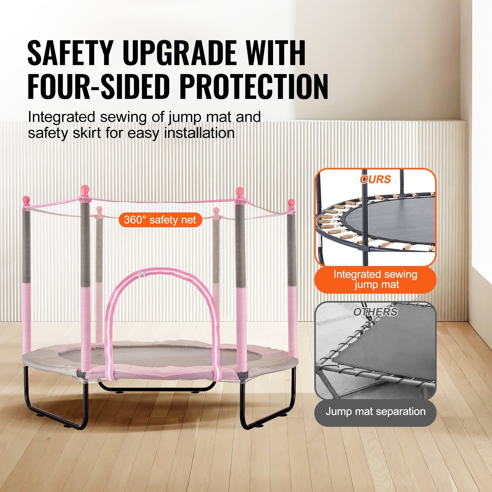 Uppgraderad hoppmatta: Hoppmattan är integrerad med säkerhetskjolen, med en robust design för ökat skydd. Med 36 fjädrar som stöder en maxvikt på 120 kg (265 lbs), garanterar vår utomhustrampolin för småbarn säkerhet under varje hopp. Sex säkerhetsstolpar, ett 360° nät och en U-formad dragkedja ger ett omfattande skydd för ditt barn.