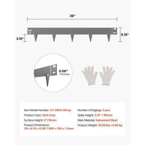 Vad du kommer att få: Varje set innehåller 5 metallrabatter, 1 par installationshandske och 1 bruksanvisning. Den utökade spikdesignen säkerställer enkel installation genom att hjälpa barriären att penetrera marken med mindre ansträngning. Ägna mer tid åt att njuta av din trädgård och mindre tid på att underhålla den!
