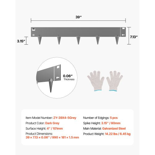 Vad du kommer att få: Varje set innehåller 5 metallrabatter, 1 par installationshandske och 1 bruksanvisning. Den utökade spikdesignen säkerställer enkel installation genom att hjälpa barriären att penetrera marken med mindre ansträngning. Ägna mer tid åt att njuta av din trädgård och mindre tid på att underhålla den!