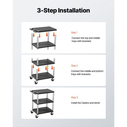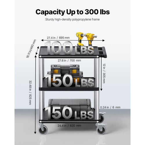 Idealisk storlek och tung last: Denna plastvagn är utformad för både kompakthet och styrka och mäter 69,5 x 46 x 82,5 cm (27,4 x 18,11 x 32,48 tum). Det övre facket rymmer 100 lbs (45 kg), medan de mellersta och nedre facken stöder 150 lbs (150 kg) vardera. Med 30 cm mellanrum mellan facken får den enkelt plats med höga föremål utan att det blir för trångt. Lasta tryggt, säkra din utrustning och rulla smidigt!