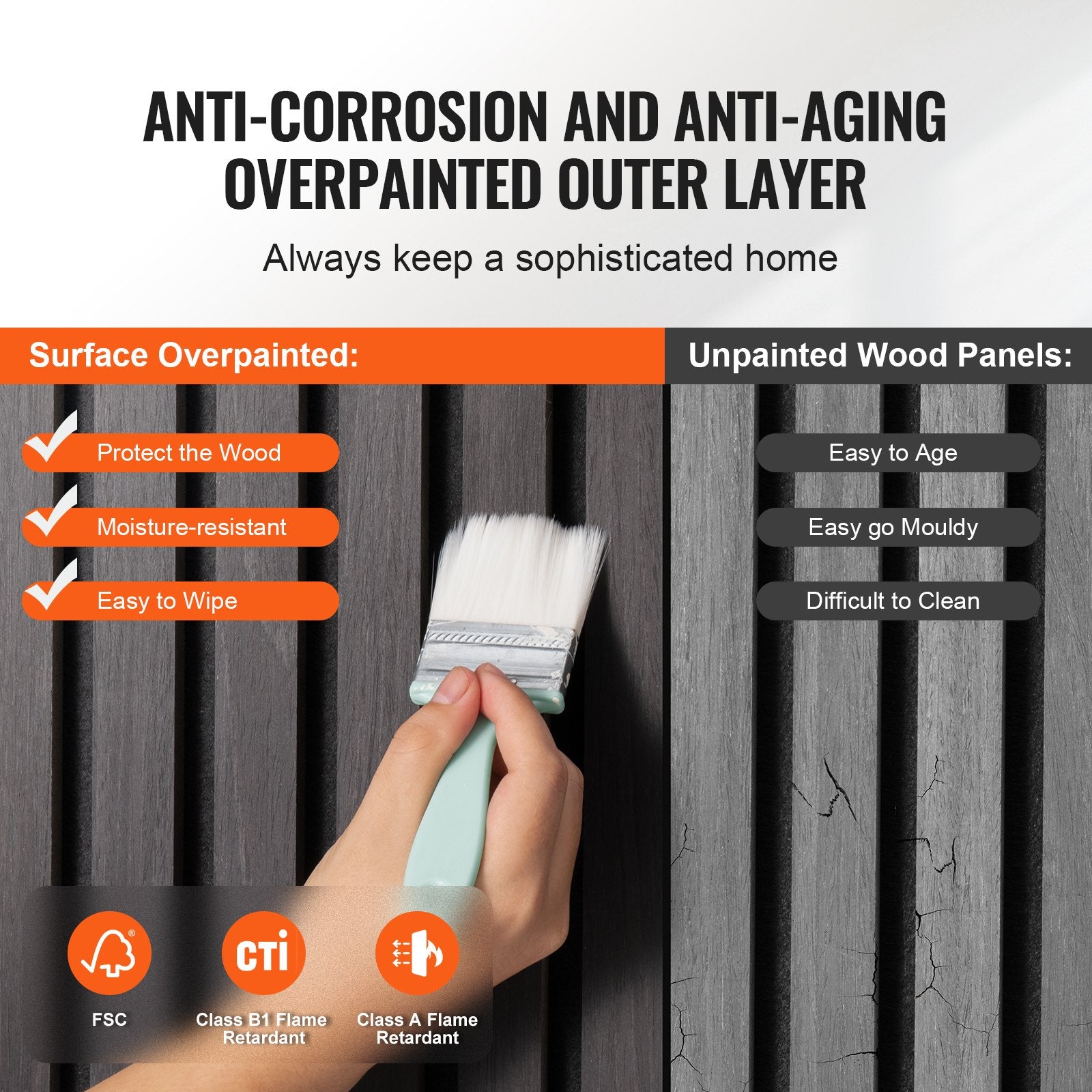Anti-Aging Coating: Det yttre lagret är behandlat med en korrosionsbeständig, anti-aging finish som uppfyller FSC och B1 brandsäkerhetsstandarder. Detta förbättrar inte bara träets hållbarhet utan ger också utmärkt säkerhet för ditt hem, vilket gör den dagliga rengöringen till en lek.