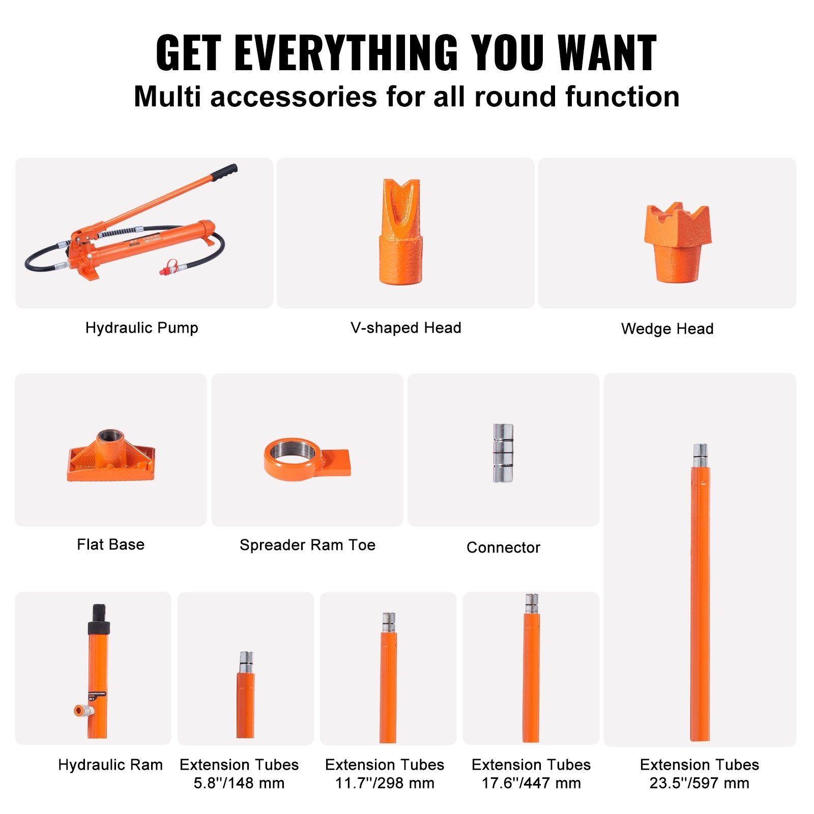 Perfekt för alla dina behov: Den bärbara hydrauliska ramsatsen innehåller allt du behöver för att slutföra ditt reparationsarbete! Hydraulpump, hydraulcylinder, 3 st förlängningsrör, V-format huvud, kilhuvud, koppling, platt bas, spridarcylinder tå. Du kommer att vara redo att ta dig an alla projekt utan att svettas.