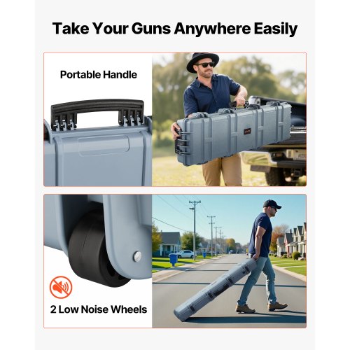 Bärbar och enkel att flytta: Utrustad med två tysta hjul kan denna hårda vapenväska enkelt transporteras i offentliga utrymmen, vilket minimerar störningar. Flera ergonomiska handtag gör det enkelt att lyfta och bära, vilket ger maximal flexibilitet och bekvämlighet.