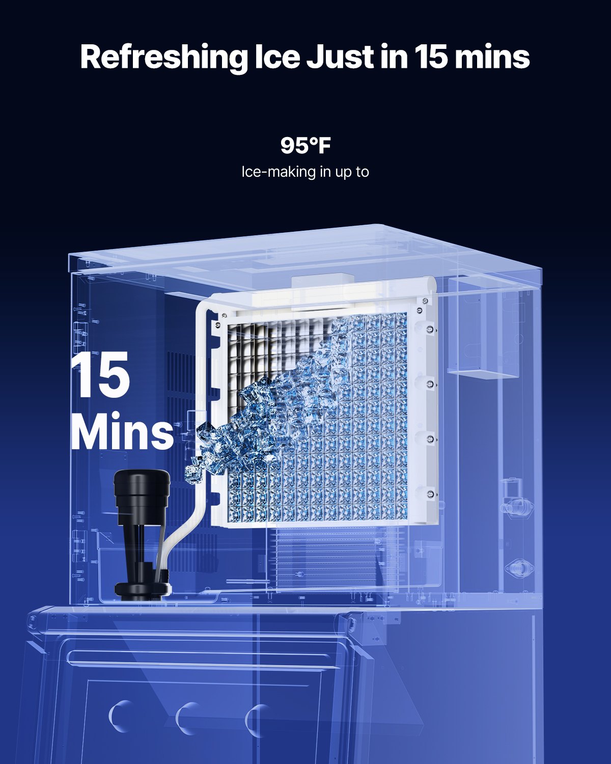 Snabb isproduktion: Den kommersiella ismaskinen är utrustad med 156 isbrickor. Du kan justera tjockleken på isen genom att öka eller förkorta istillverkningstiden. Den kraftfulla kompressorn kan producera isbitar på bara 12-15 minuter.