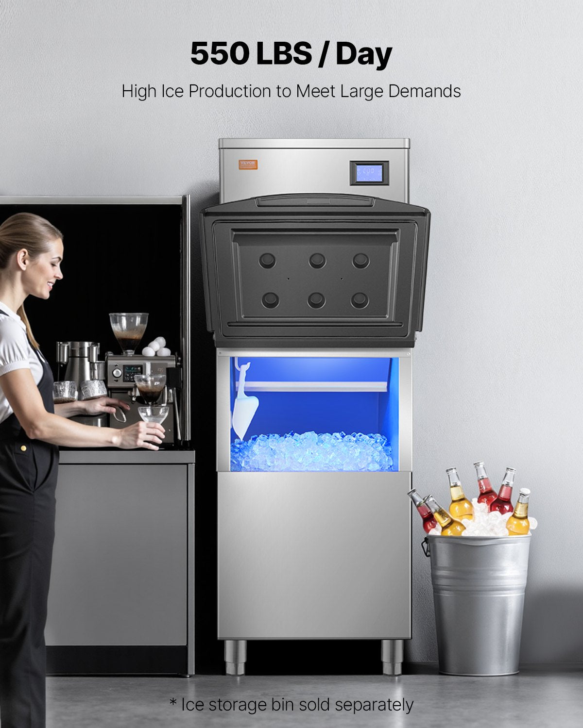 Stor isproduktion: Den kommersiella ismaskinen (huvudet) kan producera 550 lbs is per 24 timmar, vilket är ungefär 15 000 isbitar, vilket ger en kontinuerlig tillförsel av is i stora mängder.