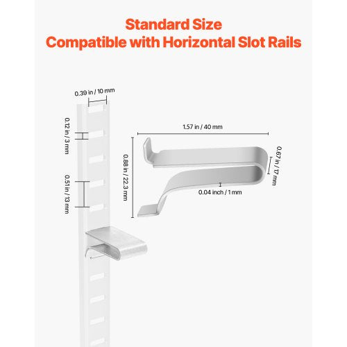 Standardpassform: Dessa hyllklämmor mäter 0,67 x 0,88 x 1,57 tum och passar perfekt till horisontella spårskenor för en säker och sömlös installation.