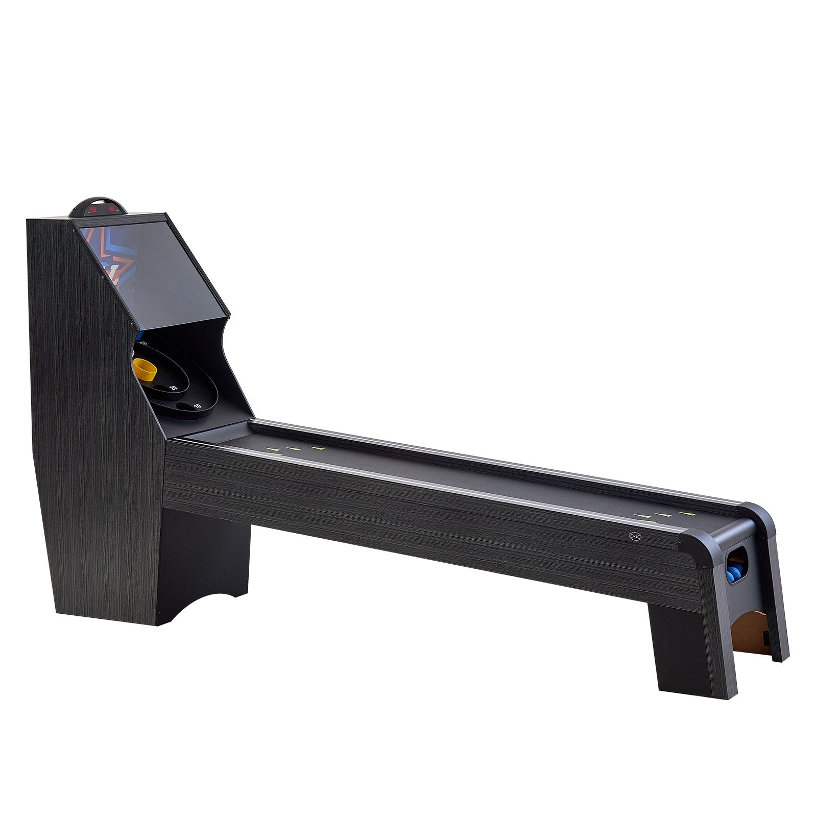 Uppslukande spelatmosfär: Med LED-arkadeffekt, elektronisk målskytt och bollbarriär i akryl skapar detta arkadspelbord i Skeeball en uppslukande spelupplevelse. Akrylbarriären hjälper till att säkerställa säkerheten under spelet, förhindrar effektivt att bollen stänker och håller spelarna säkra från oavsiktliga skador.