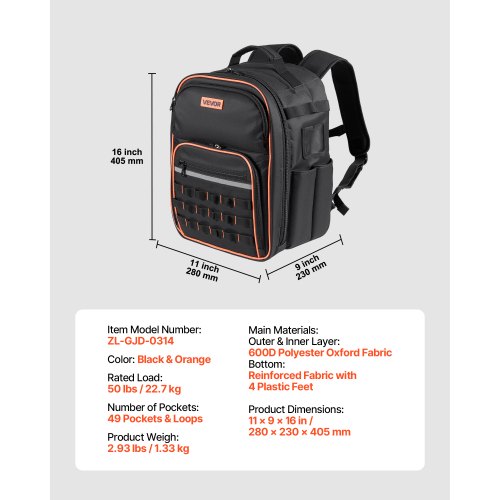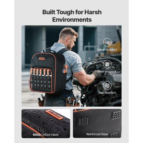 Ergonomisk design för komfort: Säg adjö till axelbelastning! Med breda, vadderade remmar och justerbara bröstspännen gör denna arbetsplatsryggsäck det enkelt att bära tunga verktyg. Den andningsbara ryggpanelen håller dig sval och det övre handtaget ger ökad mångsidighet.
