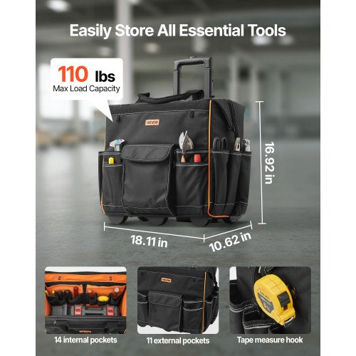 Stor förvaringskapacitet med 25 fickor: Denna rullande verktygsväska är rymlig och rymmer alla dina viktiga verktyg med en kapacitet på 50 kg. Med 25 fickor, inklusive 14 innerfickor och 11 ytterfickor, har det aldrig varit enklare att organisera dina verktyg! Det orange fodret hjälper dig att hitta det du behöver snabbt.