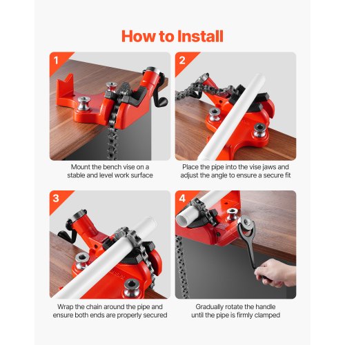 Stor klämkapacitet: VEVOR bänkkedjeskruvstäd rymmer ett brett utbud av rördiametrar, med en klämkapacitet på 1/4" - 6" och en kedjelängd på 28 tum. Två medföljande bockformar möjliggör exakt bockning av rör.