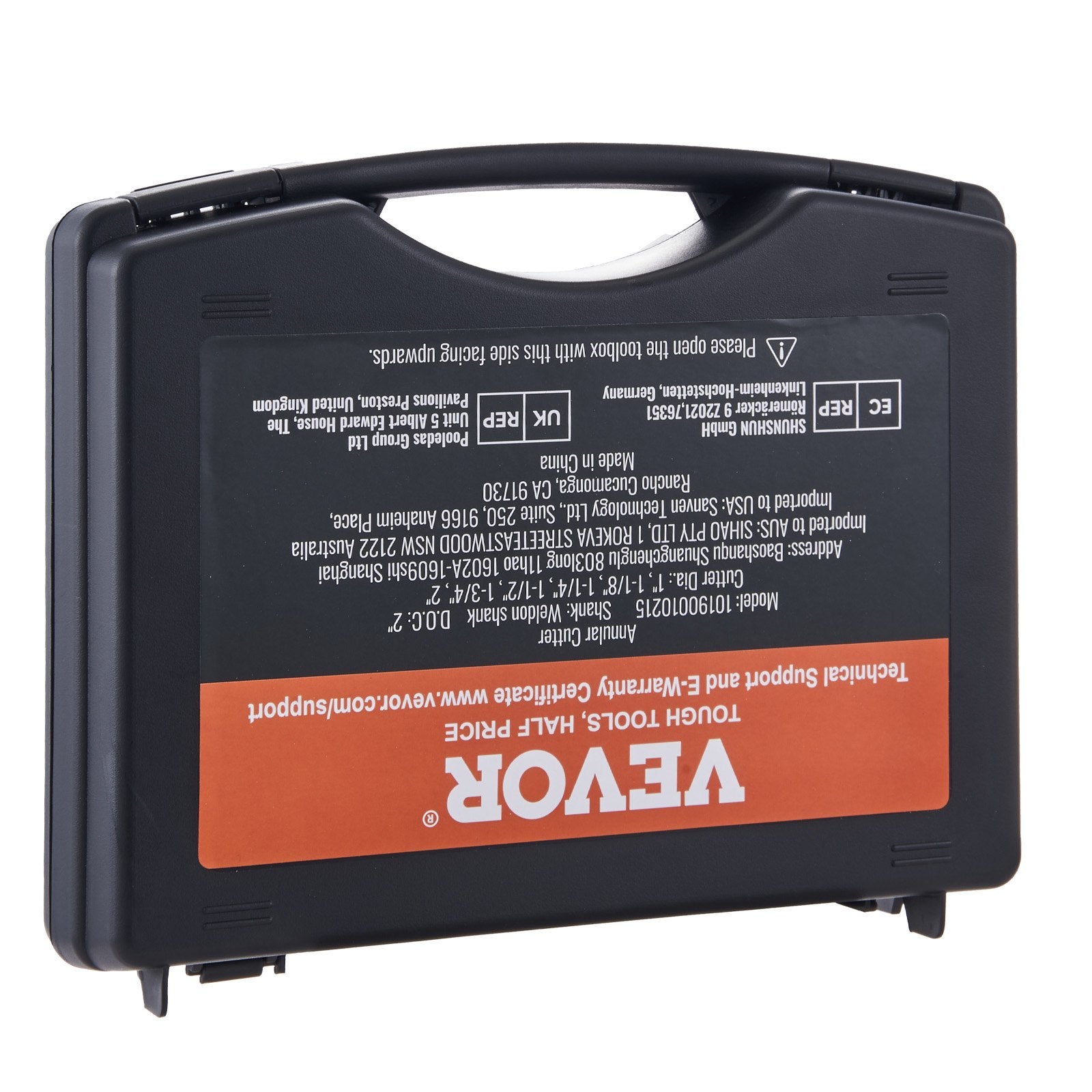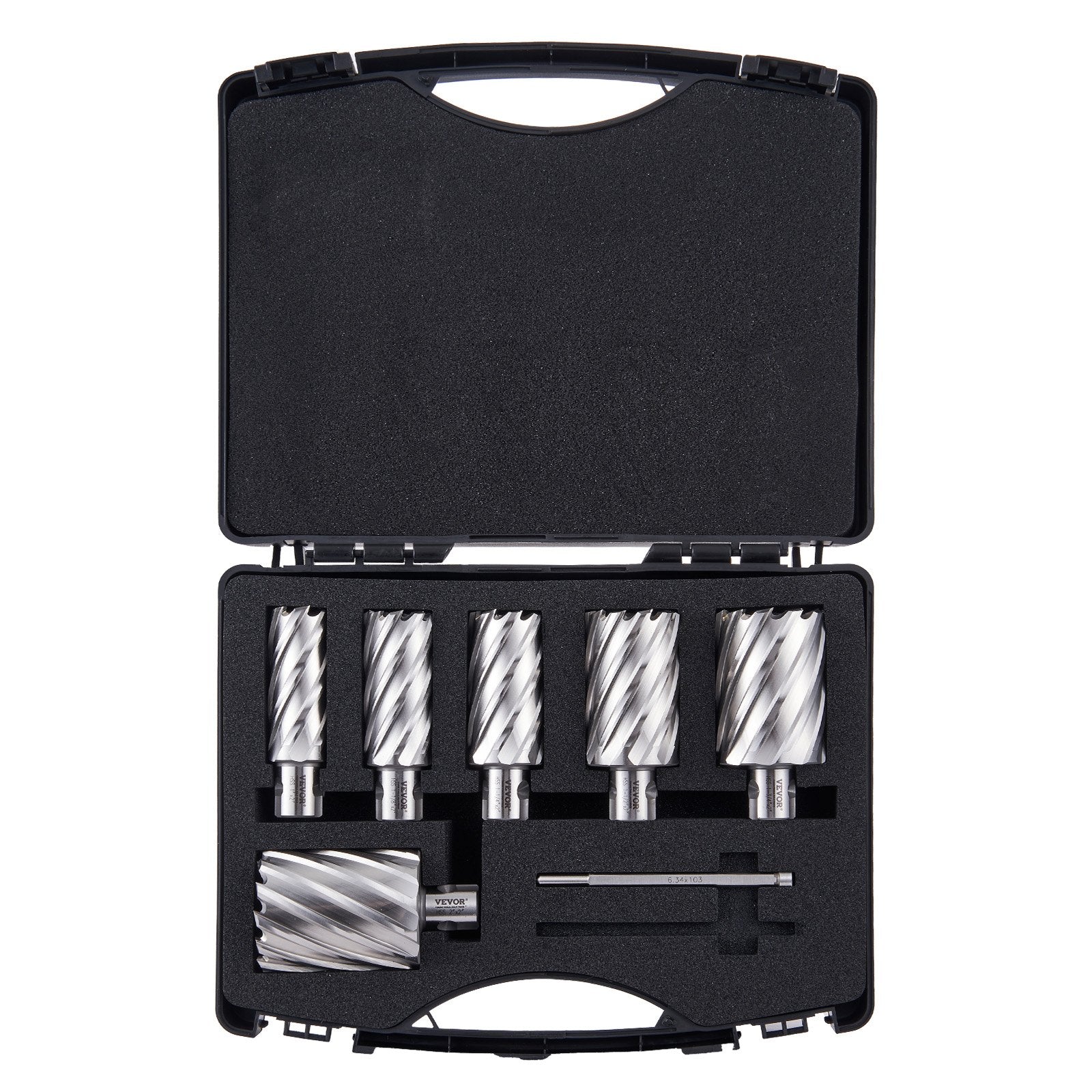 Ringformigt skärset, 6 st universalskaft Mag-borr, 2" skärdjup, 1" till 2" skärdiameter, M2AL höghastighetsstål, med 2 pilotstift och bärbart fodral, för användning med magnetiska borrar