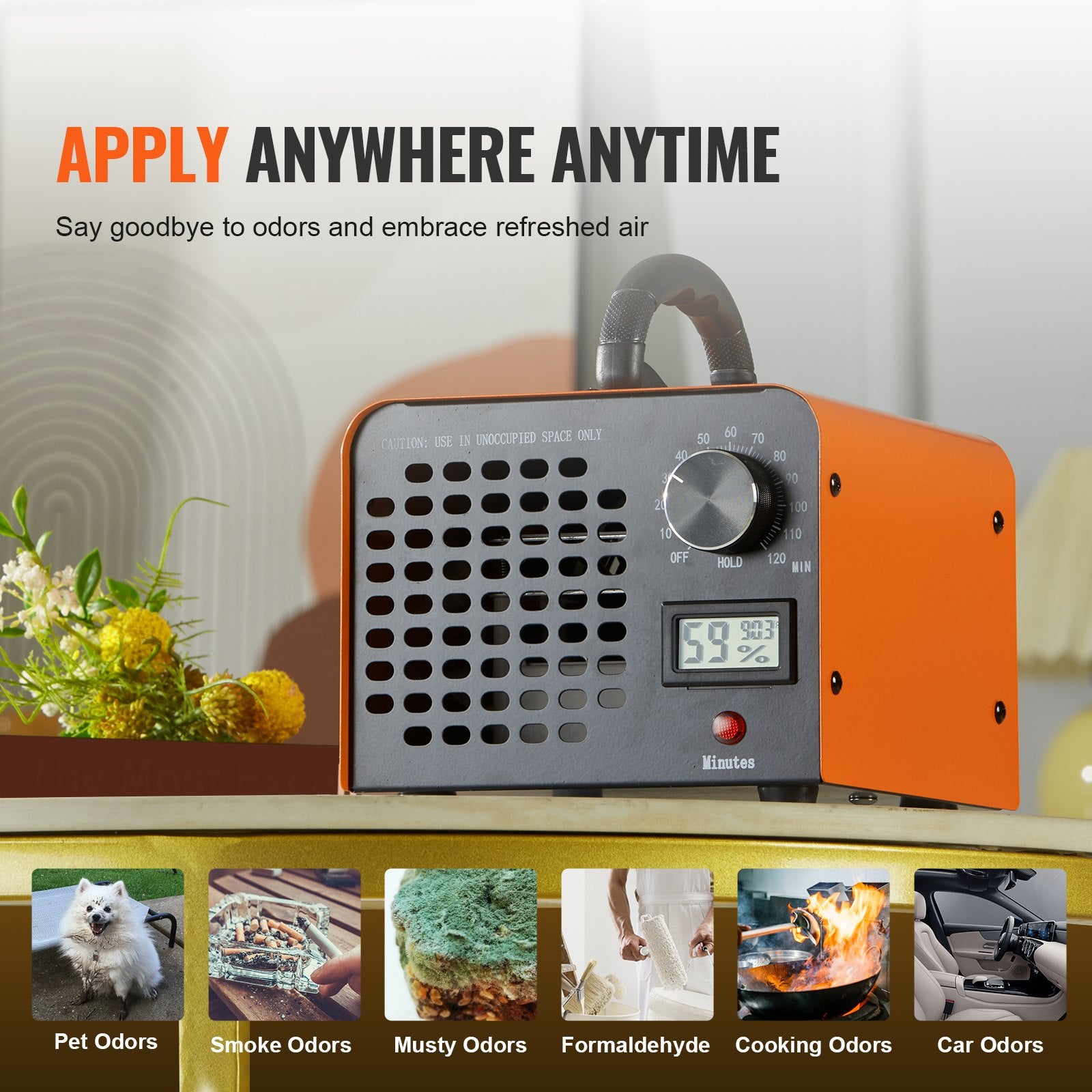 Intelligent Timing Control: Denna kommersiella ozongenerator kommer med fuktighetsdisplay och 0-120 minuters timerfunktion. Du kan anpassa den nödvändiga drifttiden i upp till 120 minuter och använda "HOLD"-läget för att hålla den igång kontinuerligt. Fuktighetspåminnelsen uppmanar dig också att hålla torr inomhus för bättre luktborttagningseffektivitet.