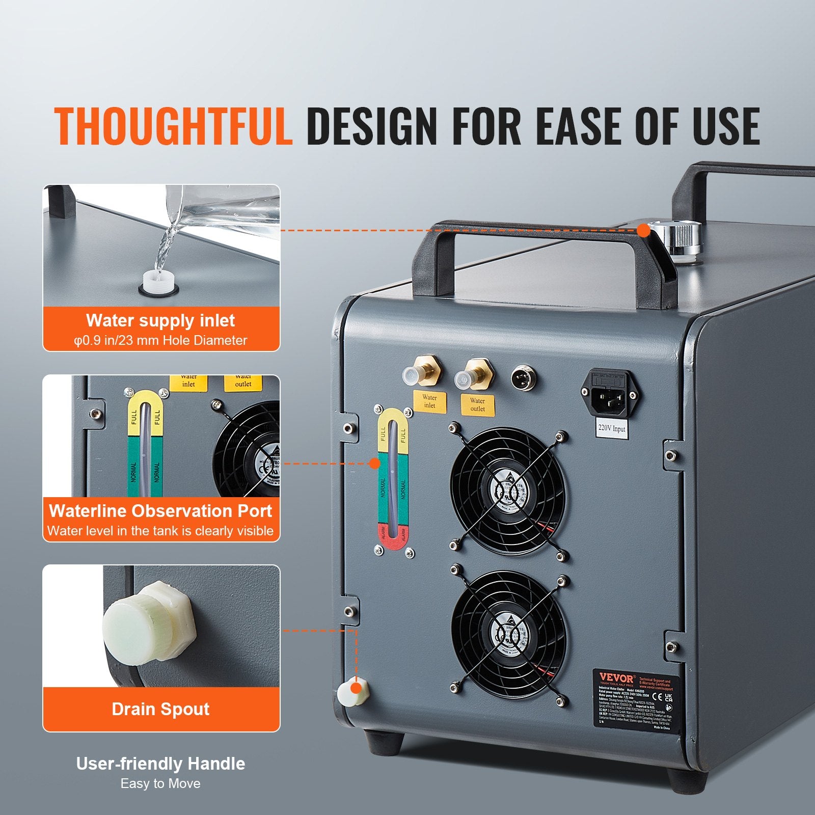 Långvarig kyleffekt: Vår industriella vattenkylare har en stor vattentank på 12 liter och låter värmen spridas över en större volym vatten, vilket ger en mer varaktig kyleffekt. Det tydliga observationsfönstret håller dig informerad om när det är dags att fylla på vatten. Säg adjö till ständiga kontroller och hej till kontinuerlig, sömlös kylning.