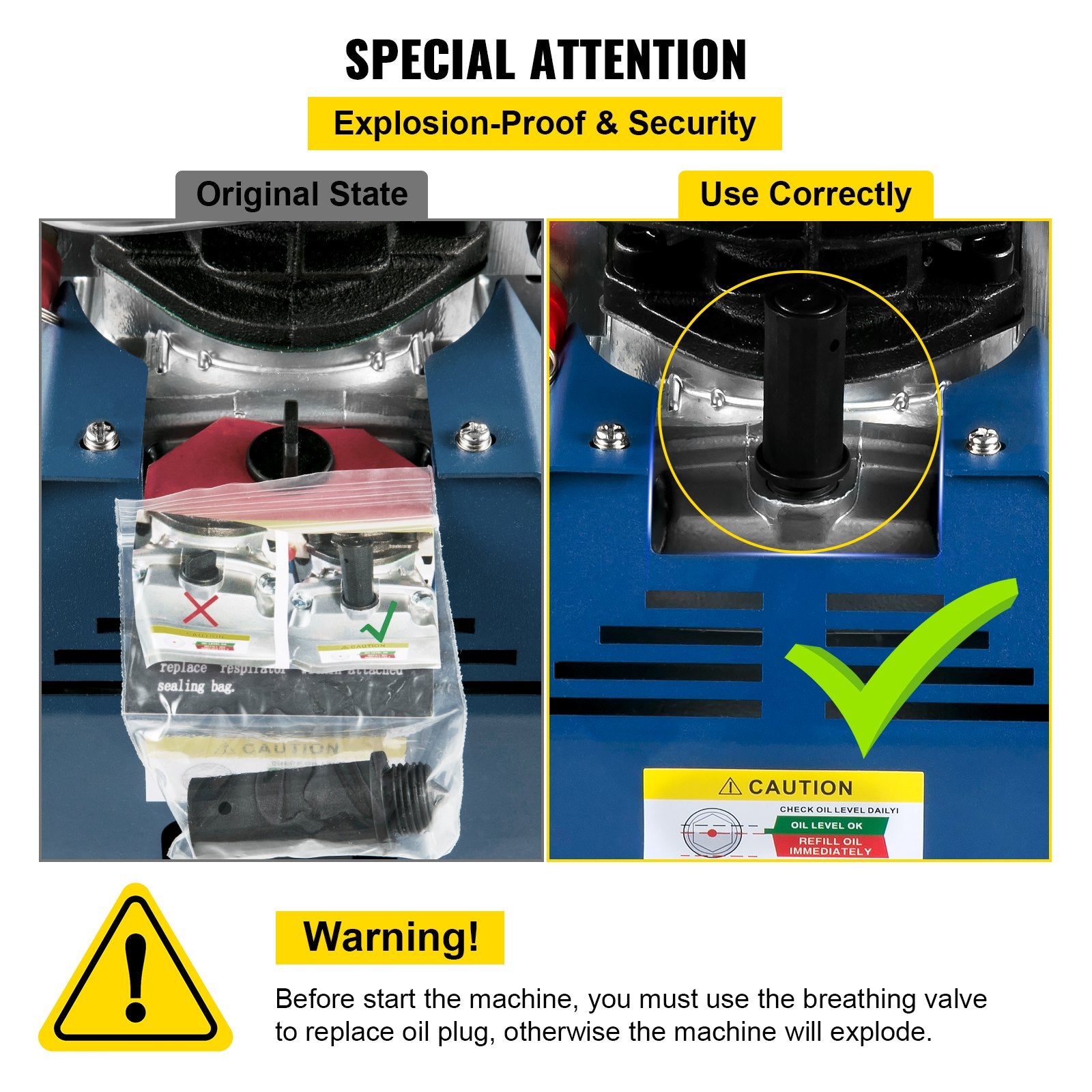 Olika skydd: Paintball-kompressorn har en explosionssäker ventil, främre och sidostängsel, vilket ger dig mer säkerhet. Observera: För att undvika fara måste du använda andningsventilen för att byta ut oljepluggen innan du kör maskinen.