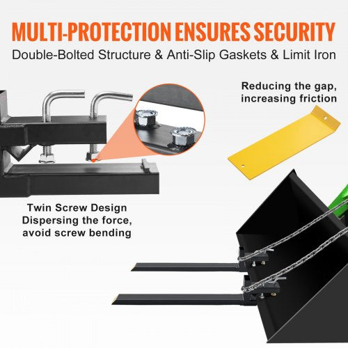 Enkel installation och mångsidig: Vår traktorgaffel är designad för att hantera en mängd olika uppgifter. Skjut helt enkelt gaffeln över skäreggen på din skopa och klämma fast den för att låsa den på plats. Du kan använda den för att flytta stockar, ved och ved, transportera staketstolpar och höbalar, rensa skräp och buskar med mera.