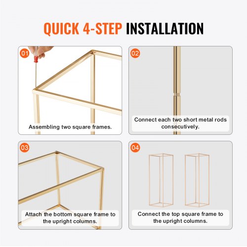 Enkel montering: Montering av detta bröllopsblomstställ är enkelt och kräver inga verktyg. Följ bara dessa 4 steg: Steg 1: Börja med att installera de två fyrkantiga ramarna. Steg 2: Sätt ihop de två mindre metallstavarna en efter en. Steg 3: Anslut den nedre kvadratiska ramen till kolumnerna. Steg 4: Anslut den övre fyrkantiga ramen till kolumnerna. Du kan slutföra monteringen på bara några minuter.