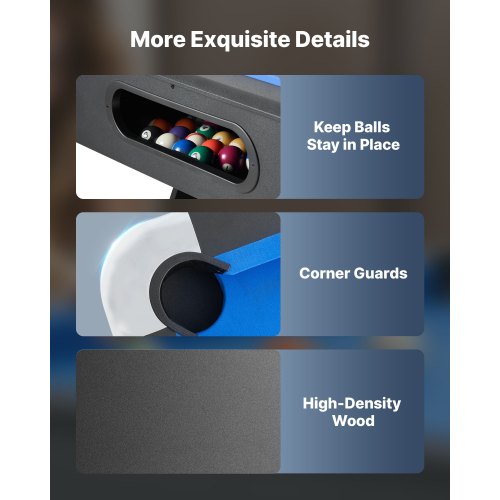 Utsökta detaljer: Förstärkta nät håller bollarna tätt, medan hörnen skyddar ditt bord och dina väggar. Inga fler repiga golv eller sneda slag. Premiumfiltyta och vadderad stötfångare ger biljardbordet en touch av elegans och hållbarhet.