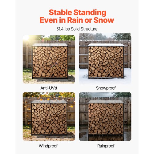 Skyddande tak: Denna vedhylla har ett tak i baldakinform och ger fullständig täckning mot regn och snö, vilket håller din ved torr och redo att användas. Perfekt för användning året runt i olika klimat och hjälper till att förlänga vedens livslängd.