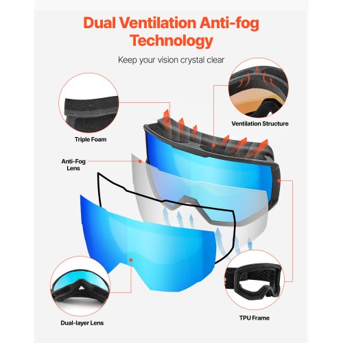 OTG-bågedesign: De breda snöglasögonen passar de flesta glasögon upp till 11,5 x 6,3 cm utan tryck. De sitter tätt utan att förskjutas, vilket ger dig en bred, fri sikt hela dagen.