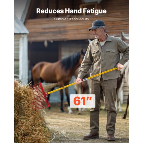 Minskat spill: Hästgödselgaffeln har en unik vinklad, spetsig tanddesign som effektivt minimerar spill vid hantering av hö eller annat löst material. Denna design förbättrar verktygets förmåga att greppa och säkra material mer effektivt.