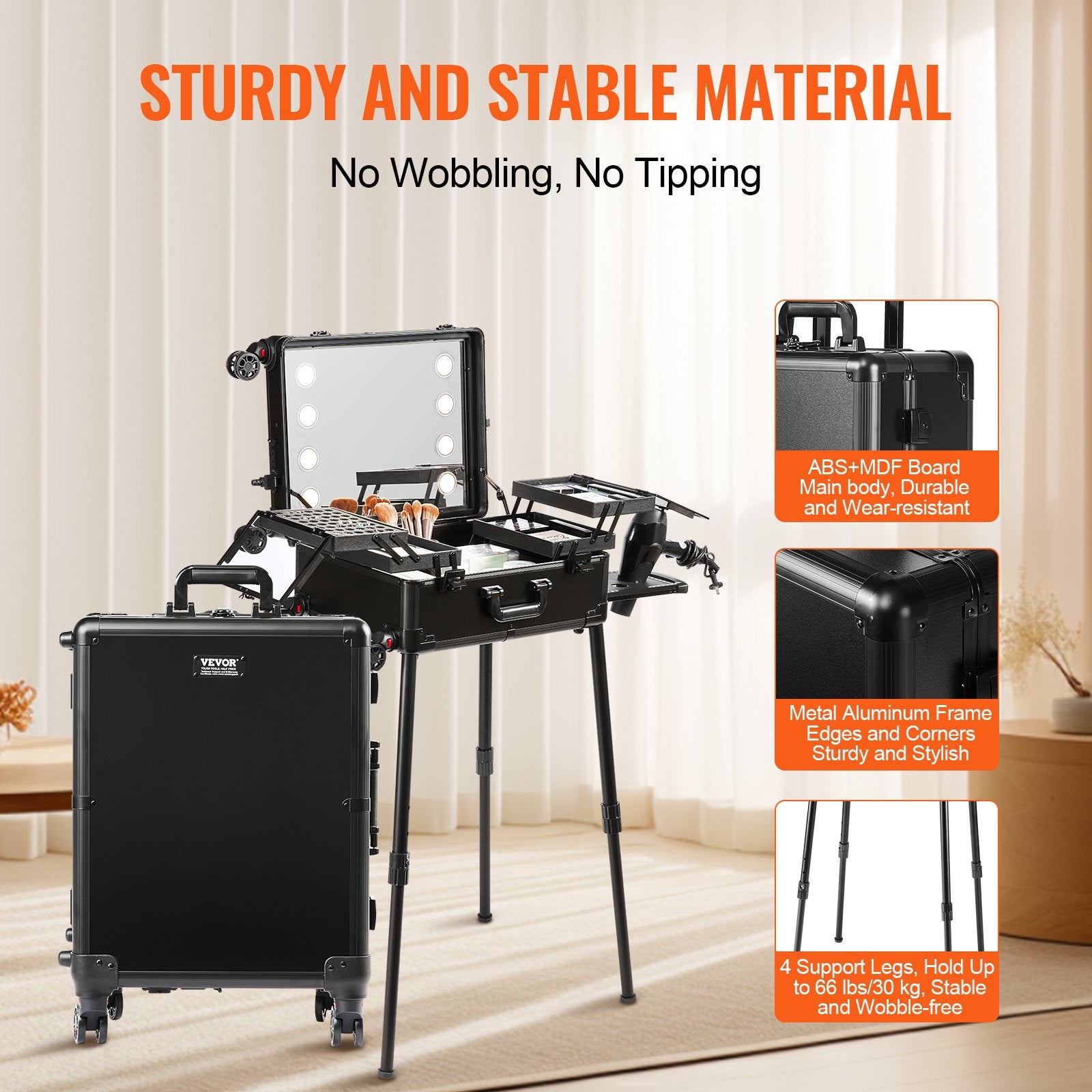 Robust och hållbar: Huvuddelen av sminkfodralet är gjord av ABS+MDF-skiva, som är höghård och slitstark. Ram- och hörnanslutningarna är gjorda av metallaluminiummaterial, vilket säkerställer stabilitet och hållbarhet. De 4 stödbenen är starka och stabila, kan hålla upp till 66 pund/30 kg utan att lätt skaka eller välta.