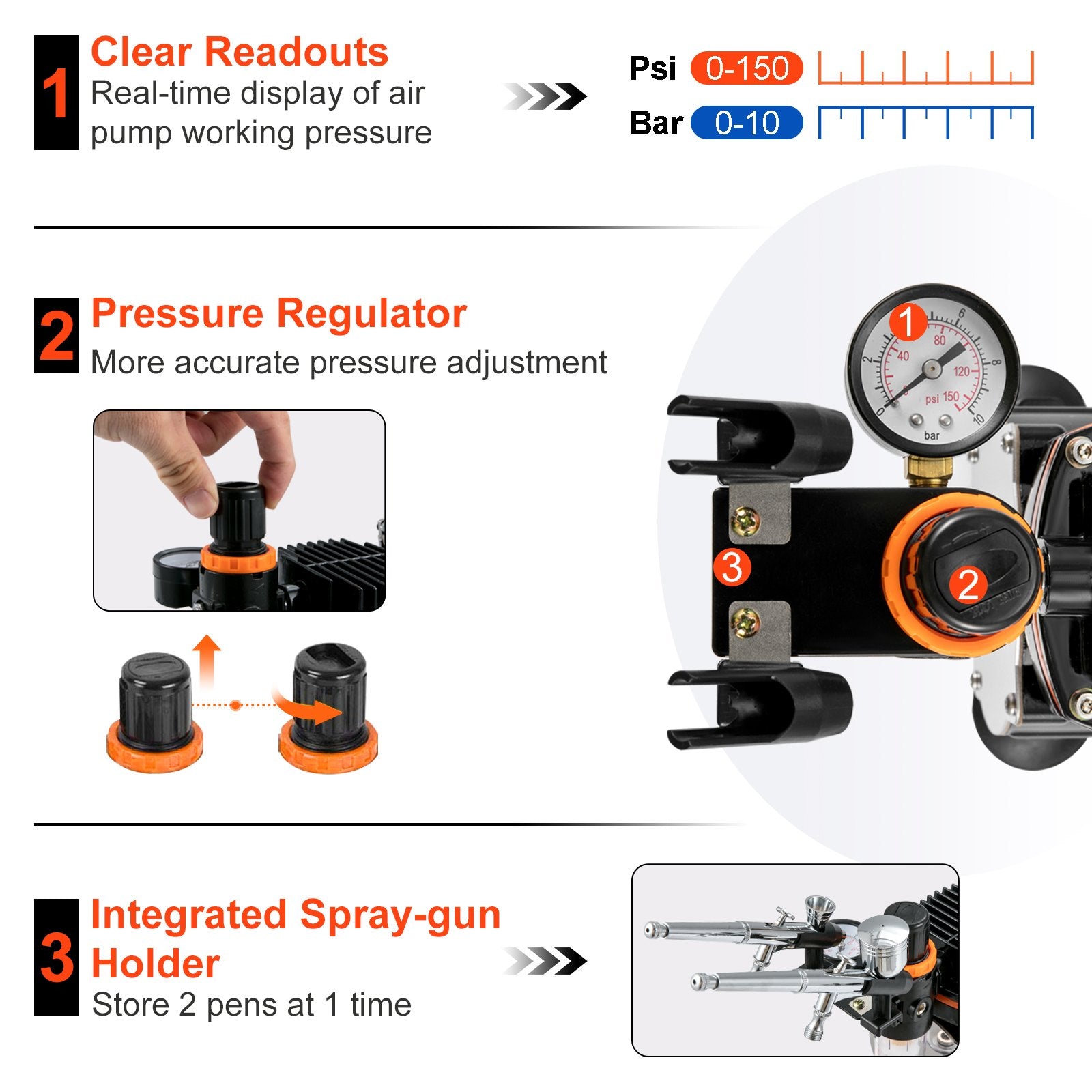 Professionell kompressor: Gör dig redo att skapa en ny kreativitetsväg. Den högeffektiva luftkompressorn kan blåsas upp snabbt och fungera stabilt under långa perioder. Utrustad med en justerbar tryckventil kan du bekvämt kontrollera realtidstrycket. Vi designade också ett bekvämt handtag på maskinens ovansida så att du kan bära och flytta.