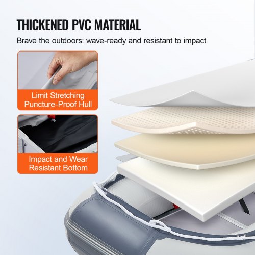 Robust konstruktion: Konstruerad med tjock PVC för överlägsen draghållfasthet och punkteringsmotstånd, denna uppblåsbara jollebåt är havsfärdig och utrustad för att hantera vågor, sandpåverkan och havsvattenerosion. Den uppgraderade designen inkluderar 4 oberoende luftkammare för ökad säkerhet, vilket säkerställer att skador på en inte äventyrar båtens flytförmåga.