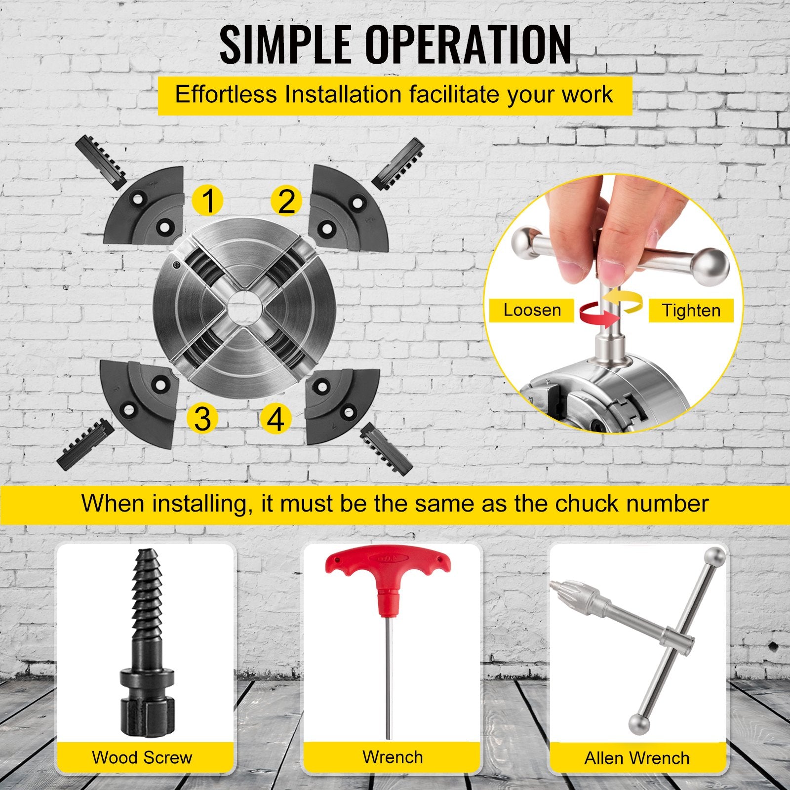 Kompletta tillbehör: Det här kompletta svarvchucksetet inkluderar en konisk växel, flera käftar och en uppsättning installationsverktyg, två deformationshylsor, som ger mycket bekvämlighet för din operation.