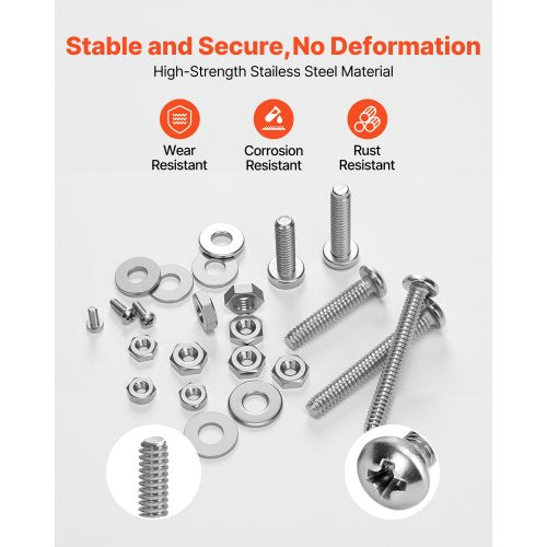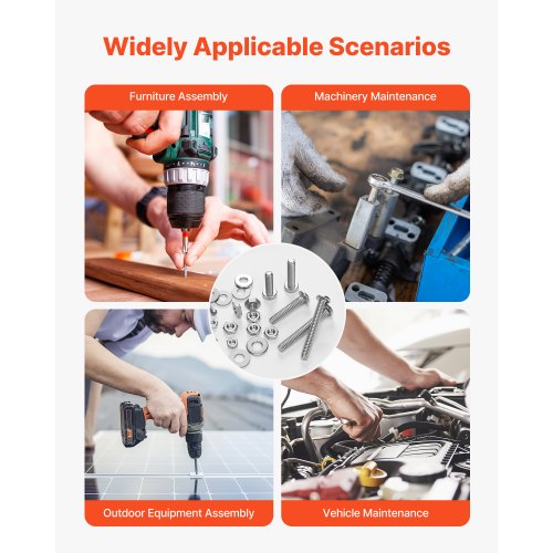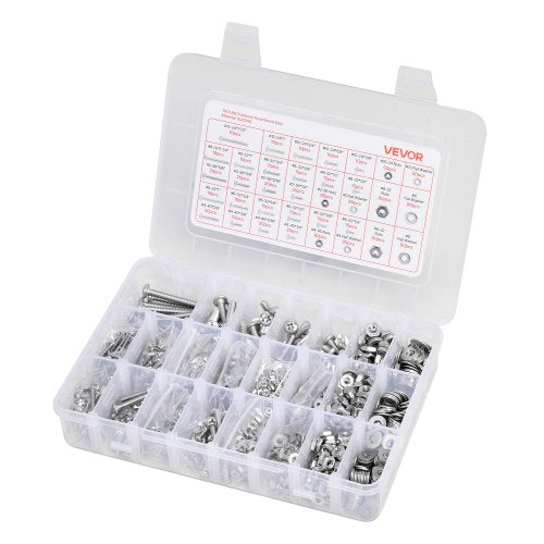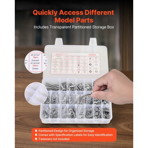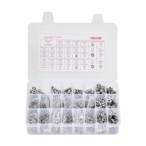 1110-delars multispecifikationssats: Innehåller bultar, muttrar och brickor i tummått i storlekarna #10-24, #8-32, #2-56, #6-32, #4-40 (med plana och fjäderbrickor i #10, #8, #2, #6, #4). Perfekt för allmänna reparationer och utbyten.