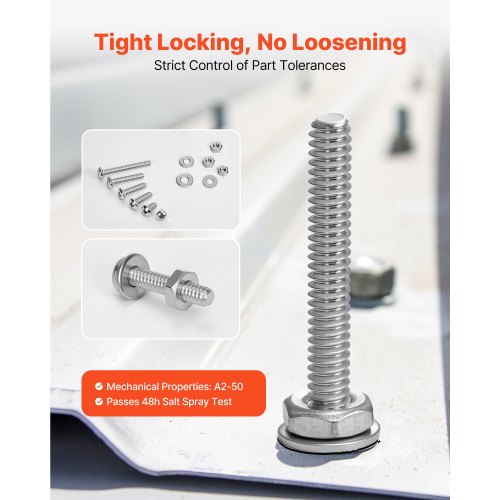Precisionstillverkning: Varje komponent är precisionsbearbetad för att uppfylla mekanisk prestanda enligt A2-50-klass. Med ett 48-timmars saltspraytest ger dessa bultar och muttrar tillförlitlig fastsättning och kommer inte att lossna eller försämras med tiden.