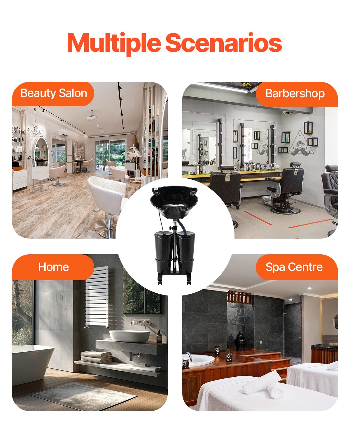 Bekväm användning: Med en design med dubbla kärl tillåter den bärbara salongsvasken enkel kontroll av vattenpumpen via en fotpedalomkopplare. Rent vatten rinner genom duschhuvudet för hårvård, medan smutsigt vatten leds in i avfallskärlet via ett icke-hopfällbart korrugerat rör. Det fristående systemet ger en effektiv upplevelse utan utrymme.