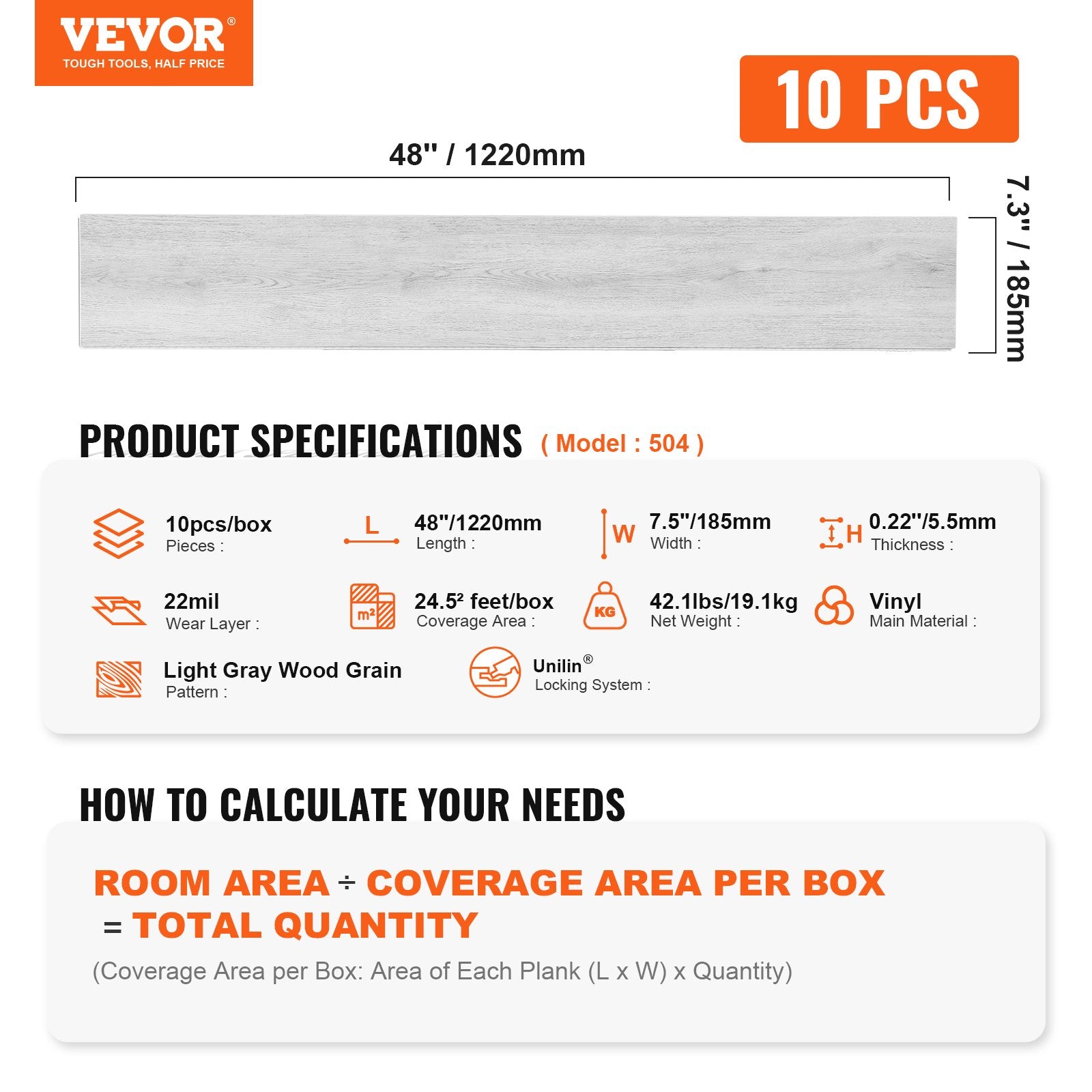 Sammankopplade vinylgolvplattor 1220 X 185 mm, 10 plattor 5,5 mm tjocka Snap Together, Ljusgrå träfibrer DIY-golv för kök, matsal, sovrum och badrum, lätt för heminredning