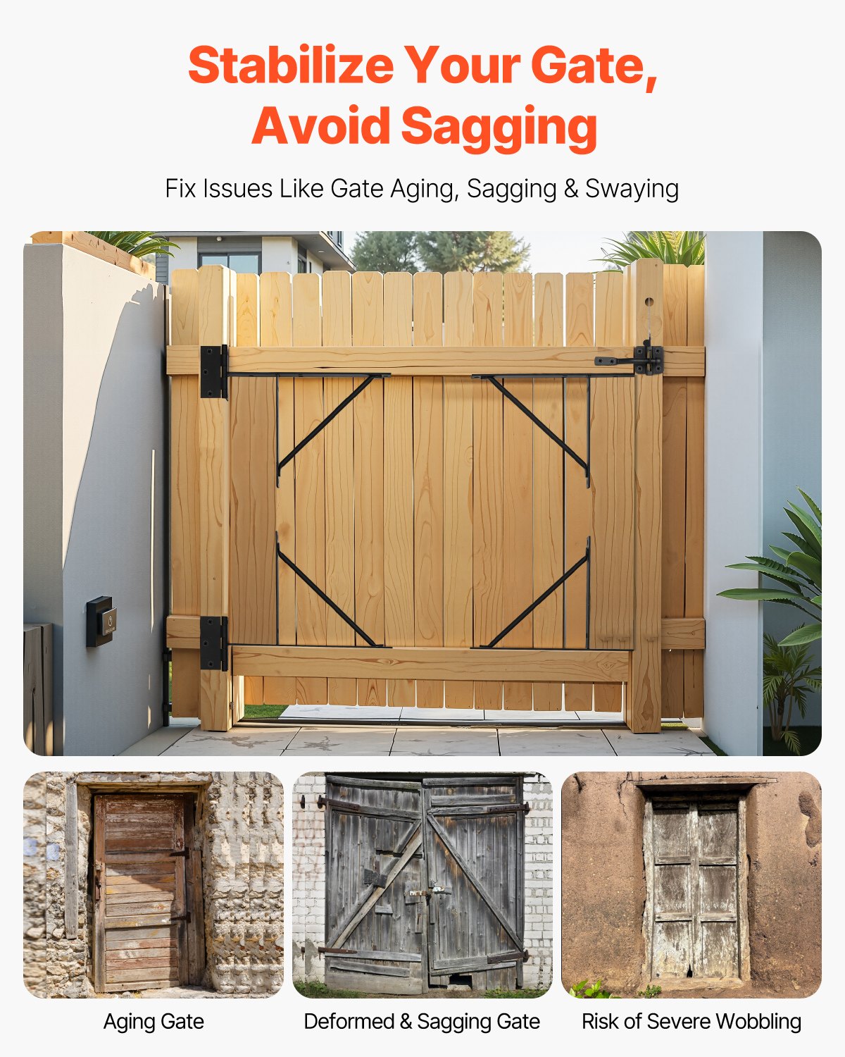 Korrosions- och rostbeständigt material: Tillverkat av kraftigt metalljärn, är detta anti-sag gate ram hårdvara kit mycket hållbart, rostbeständigt och väderbeständigt. Den är byggd för att tåla utomhuselement, lätt att hantera vind, regn och snö för långvarig användning