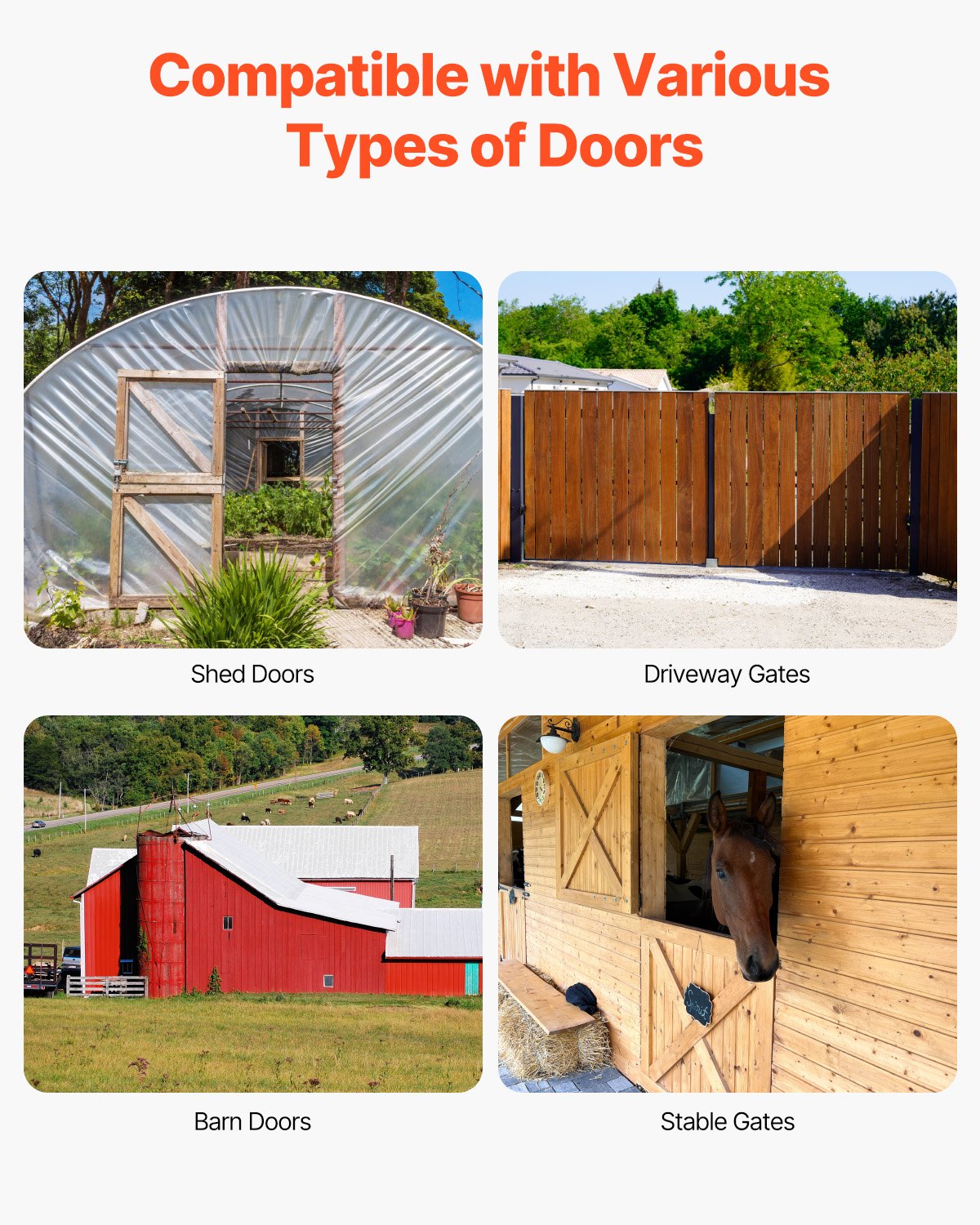 Bred kompatibilitet: Lämplig för en mängd olika dörrtyper inklusive skjuldörrar, uppfartsportar, boskapsportar, träfönster, däcksdörrar, poolportar, ladugårdsdörrar och förvaringsdörrar. Denna sats för grindkarm passar alla dörrstorlekar från 2 x 4 tum och uppåt, vilket ger mångsidiga installationsalternativ