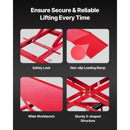Hydraulisk lyftning: Utrustad med en högkvalitativ hydraulpump lyfter motorcykelpallen med fotpedal motorcykeln utan ansträngning, vilket gör att du kan lyfta tunga motorcyklar med mindre ansträngning och minimalt motstånd. Hydraulpumpen har en läckagesäker design som säkerställer stabil lyftning.