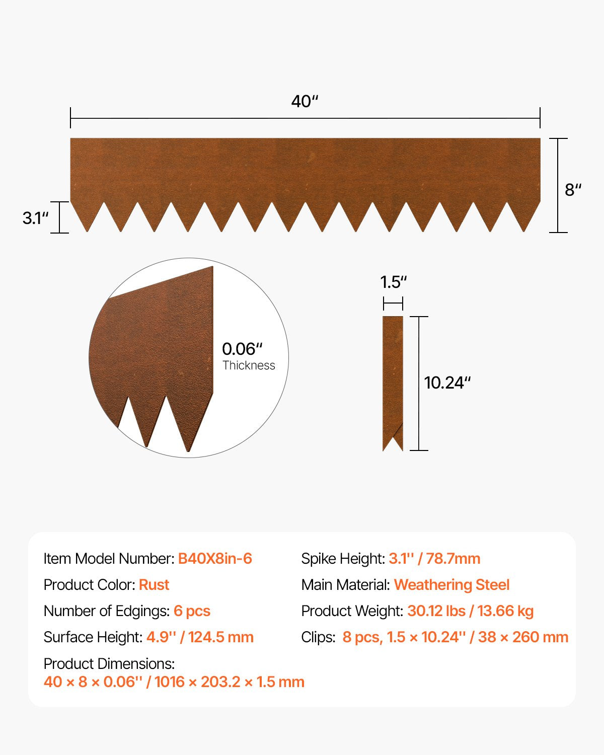 Väderbeständig och rostbeständig: Tillverkad av väderbeständigt stål, denna gräsmatta kant är förrostad i kanterna. Med tiden fördjupas rosten, vilket skapar ett skyddande lager som förbättrar korrosionsbeständigheten och förhindrar sprickbildning. När rosten är helt bildad kan du applicera ett lager polyuretanfärg för att låsa in färgen och förlänga dess livslängd.