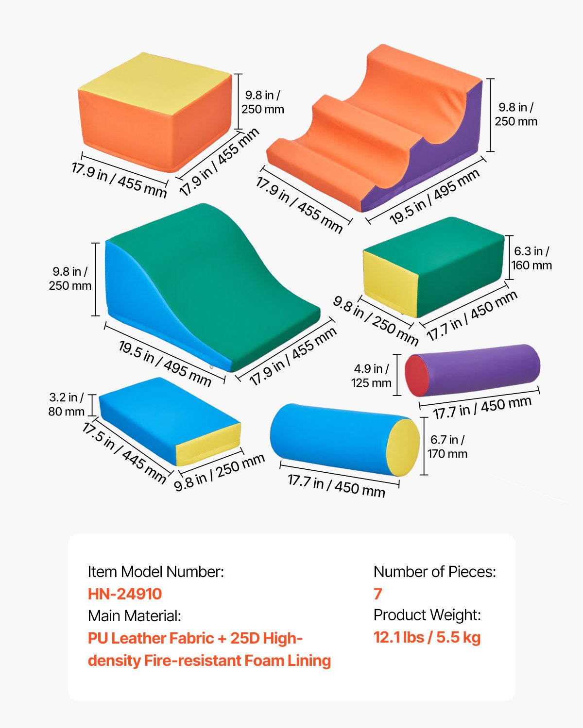 Pedagogiskt 7-delat set: Detta färgglada och roliga klätterblocksset i skum består av olika formade skumblock som stimulerar färgigenkänning och fångar ditt barns uppmärksamhet. De olika modulerna kan fritt kombineras till olika former, väcker fantasi och kreativitet, vilket håller barnen aktiva. Det är bra för hemmet, förskolor och andra miljöer, och är en idealisk present till spädbarn.