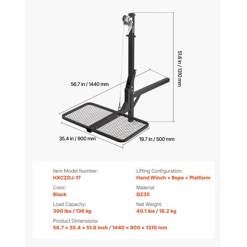 Mångsidig användning: Vår jaktlyft är utrustad med en 5 cm dragkrok, kompatibel med olika typer av vagnar. Perfekt för utomhusjakt, lyft av lantbruksdjur, transport av frukt/grönsaker eller lyft av tunga föremål utomhus.